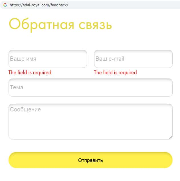 Обманщики Адал Роял предлагают пользователям заполнить бланк обратной связи, где просят указать свое имя, фамилию, отчество, адрес электронной почты и номер телефона.