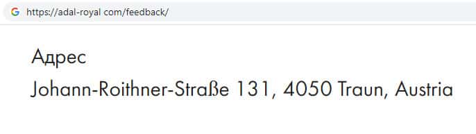 Мошенники Adal-Royal указали адрес местонахождения главного офиса своей компании, который наверняка липовый: