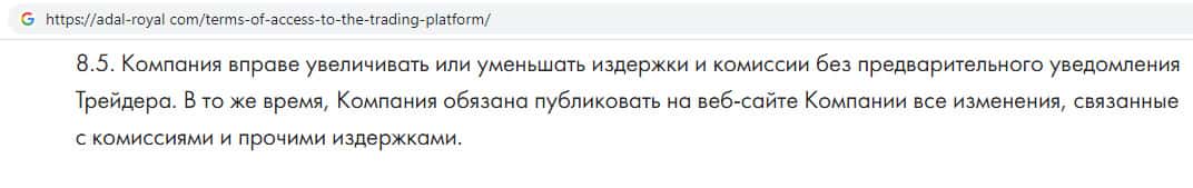 Псевдо-брокерская организация Адал Роял имеет право взымать с клиента комиссию и устанавливать любой размер комиссии.