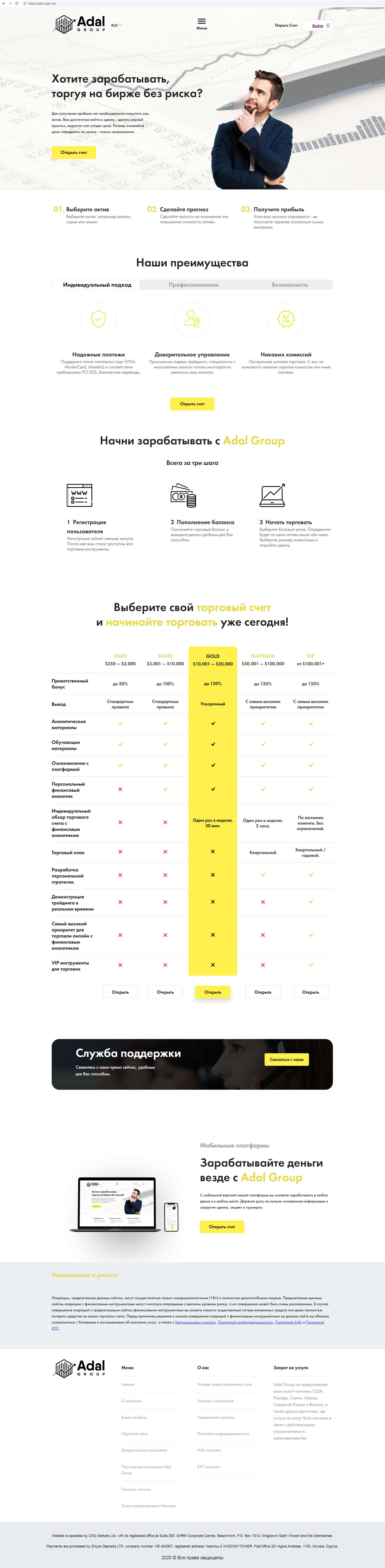 В данном разделе предлагаем увидеть скрин главной веб-страницы онлайн-ресурса псевдо-брокерской конторы Adal-Royal, помните о том, что подобные проекты очень быстро скамятся.