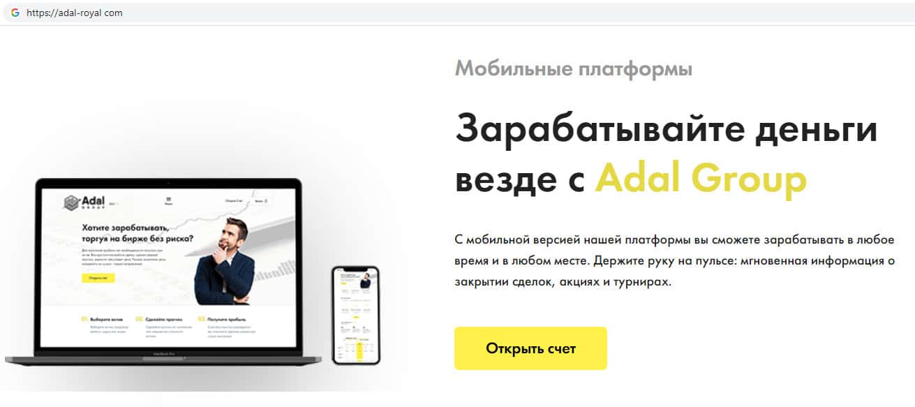 Мошенники Адал Роял предлагают воспользоваться своей фейковой торговой платформой Adal Group, где очень легко слить все свои денежные средства со счета.