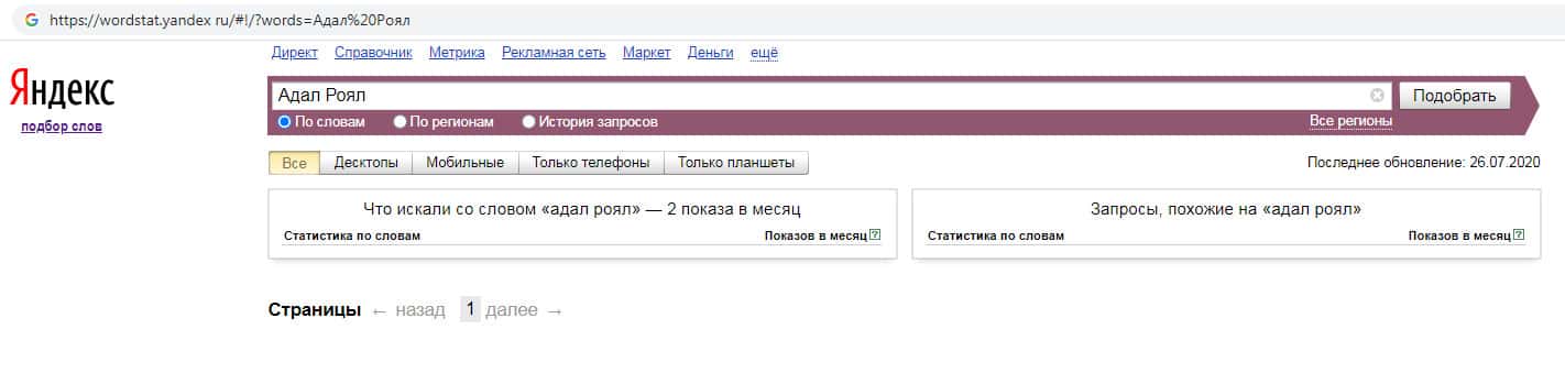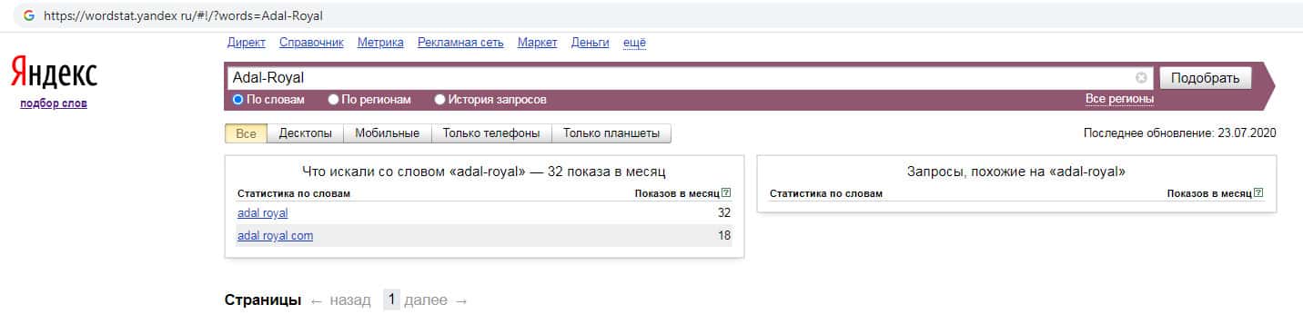 Количество запросов на бренд названия компании на английском языке без пробела "AdalRoyal" в поисковике Яндекс составляет всего лишь 2 показа за месяц.