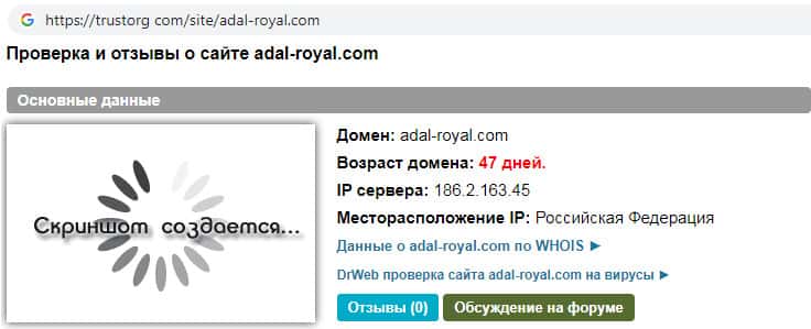 Проверка интернет-сервиса псевдо-брокерской организации Адал Роял на trustorg com показала, что возраст домена к моменту написания статьи составляет 47 дней.