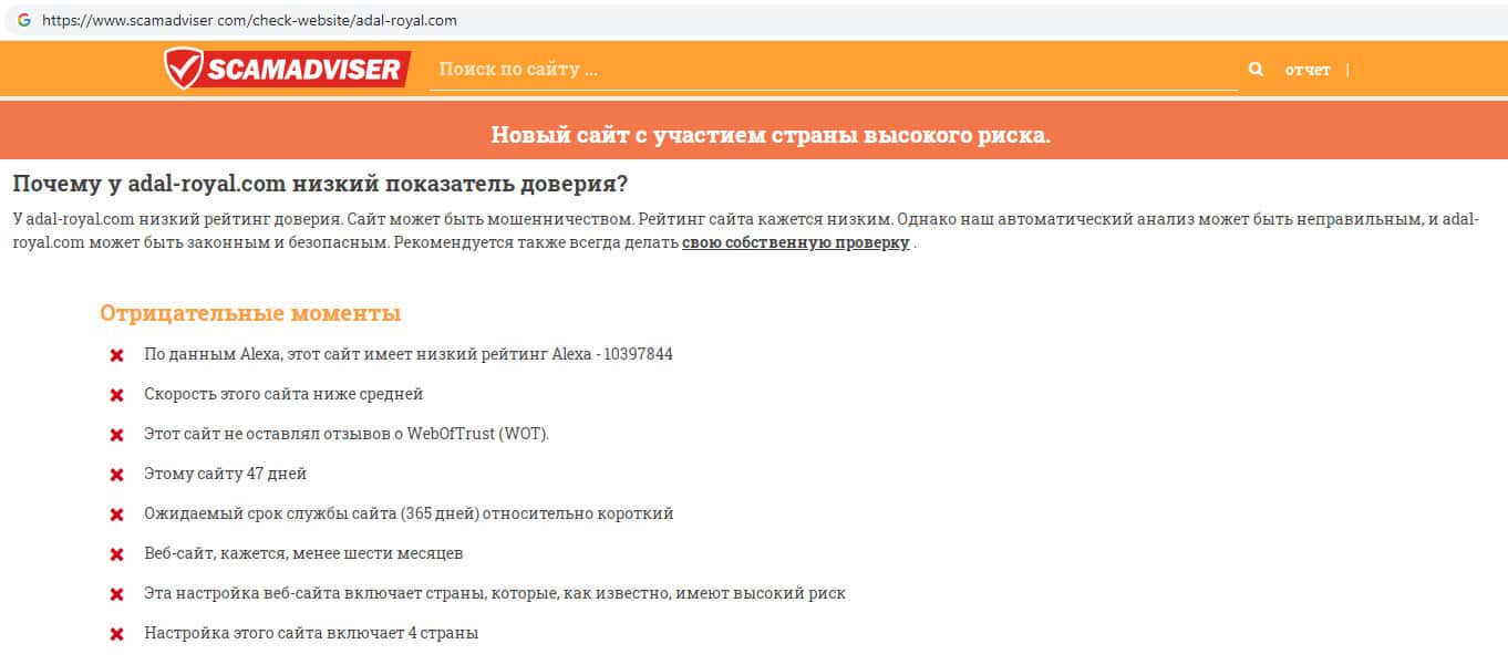 - Уровень доверия к сайту скам-конторы Адал Роял низкий