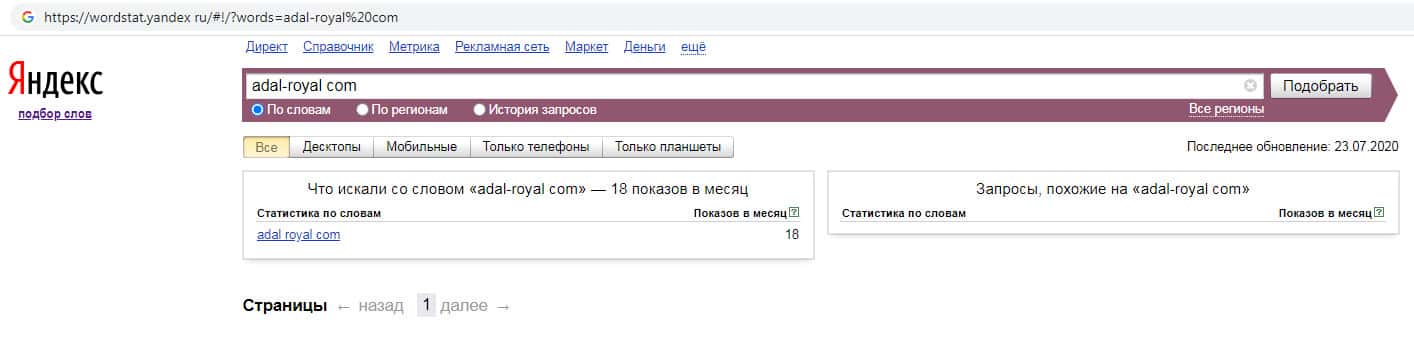 По количеству брендовых запросов названия домена без точки "adal-royal com" на Яндекс Вордстарт также 18 запросов за месяц.