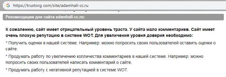 Рассмотрим и причины, которые могли поспособствовать отрицательному уровню траста у мошеннической организации Адам Холл. На сайте предоставления доменов, в основном говорится о том, что мошенники могли просить своих работников оставлять хорошие комментарии и оценки. Но как мы видим, у этой мошеннической крипто-кухни нет таких данных.