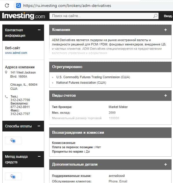 - Описание брокерской компании ADM Derivatives на интернет-ресурсе investing com