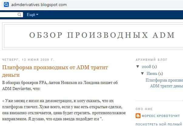Трейдер на странице ресурса admderivatives blogspot com оставил критический отзыв о компании ADM Derivatives