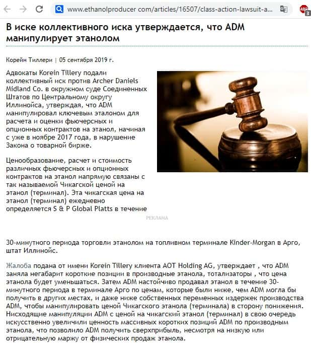 По информации с веб-портала ethanolproducer com, финансовая компания Archer Daniels Midland Company, являющаяся основателем брокерской конторы ADM Derivatives (ADM Investor Services), была замешана на фондовом рынке в мошеннических манипуляциях при торговле деривативами на Этанол, получая при этом сверхприбыли за счет других участников биржи.