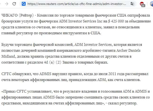 - Брокерская компания ADM Investor Services оштрафована на 425 тысяч долларов за махинации