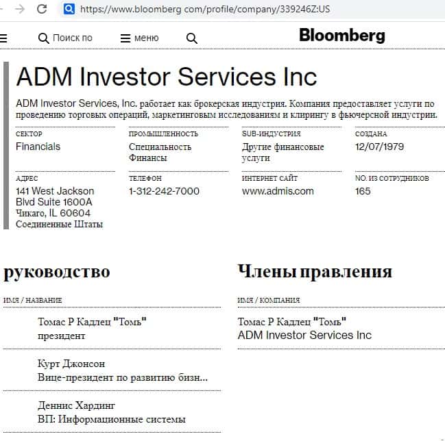 На официальном сайте брокерской инвестиционной компании ADM Derivatives (ADM Investor Services) admis com, данные о ее руководстве не представлены, зато оказалось возможным найти эти сведения на информационном интернет-ресурсе bloomberg com. Вот персональный состав команды ADM Investor Services: