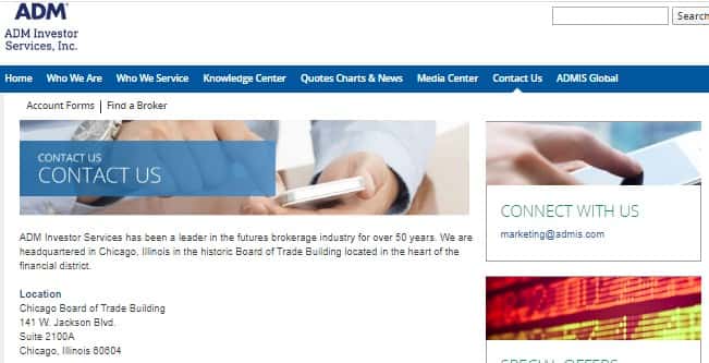 На официальном сайте брокерской инвестиционной компании ADM Derivatives (ADM Investor Services) admis com указана контактная информация для связи клиентов с администрацией этого фондового брокера: