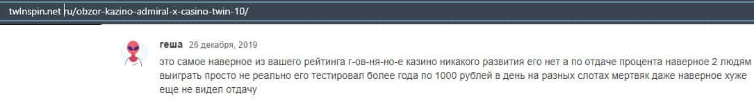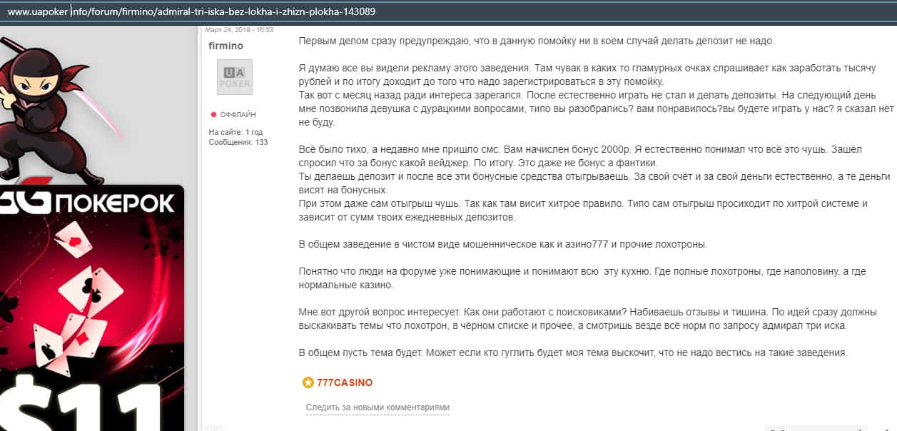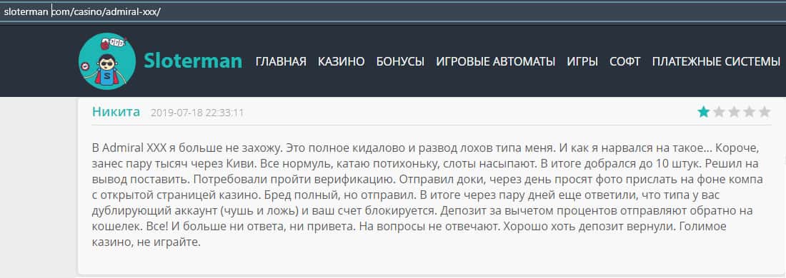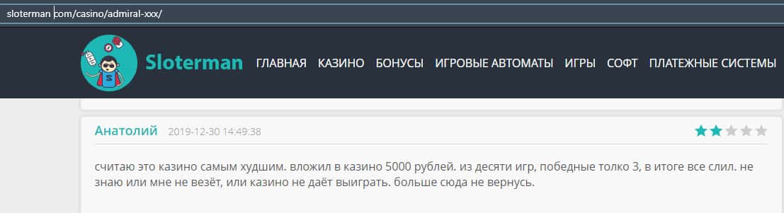 Автор следующего отзыва считает, что контора Admiral-Vip-XXX Site является говняным казином, так как он лишился там несколько раз по 1000 рублей.