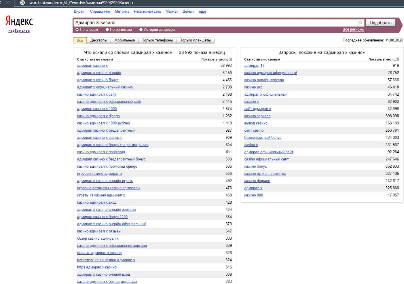 - Запросы по брендам конторы Адмирал Х Казино в Яндекс