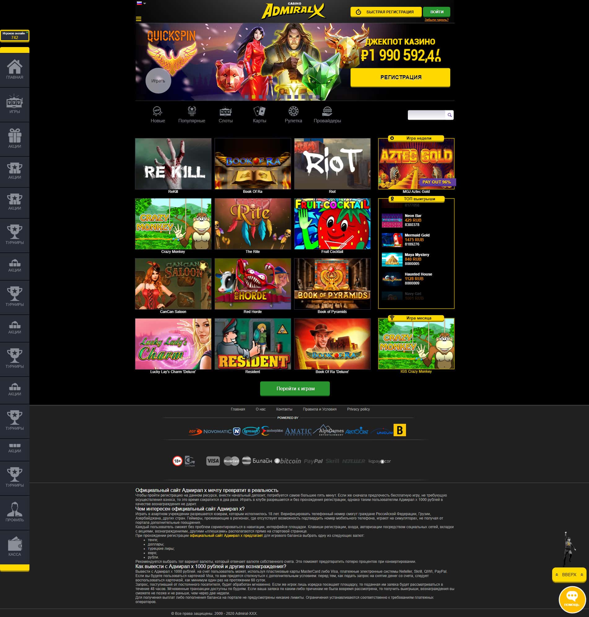 Далее представлена главная страница сайта конторы Адмирал Х Казино, которая очень опасна для интернет-пользователей и мы бы не советовали на этот сайт заходить.