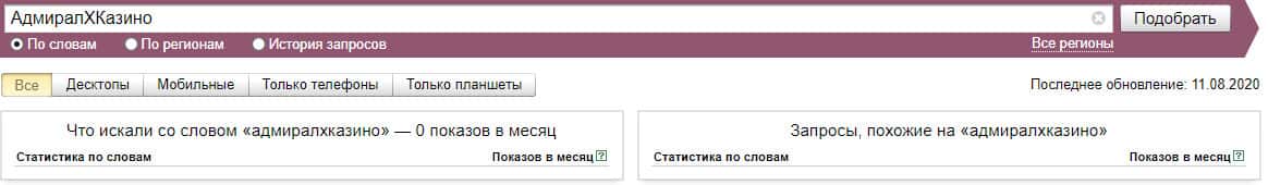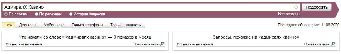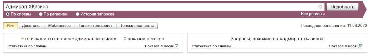 Та же самая ситуация и с брендом "АдмиралХКазино", который набрал ноль показов в месяц, что показывает их очень низкую популярность в интернете.