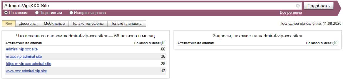 Запрос бренда "admiral-vip-xxx site" по версии Яндекс.Вордстат нашел всего-то 66 показов в месяц, что показывает их очень низкую популярность в интернете.