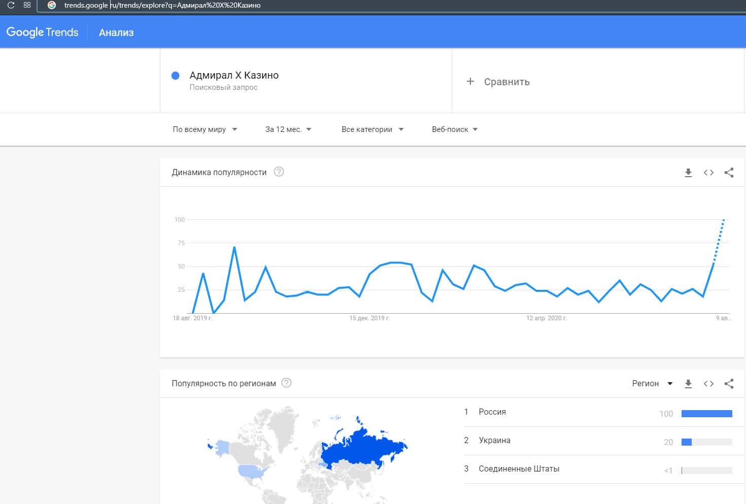 По версии Гугл Трендс мошенники с брендом "Адмирал Х Казино" набрали достаточно много запросов за последнее время и в основном они шли с России, Украины и США.