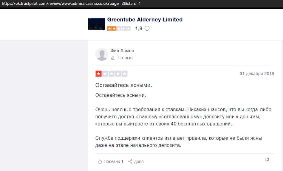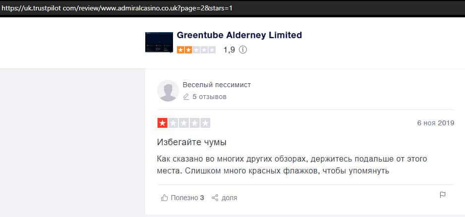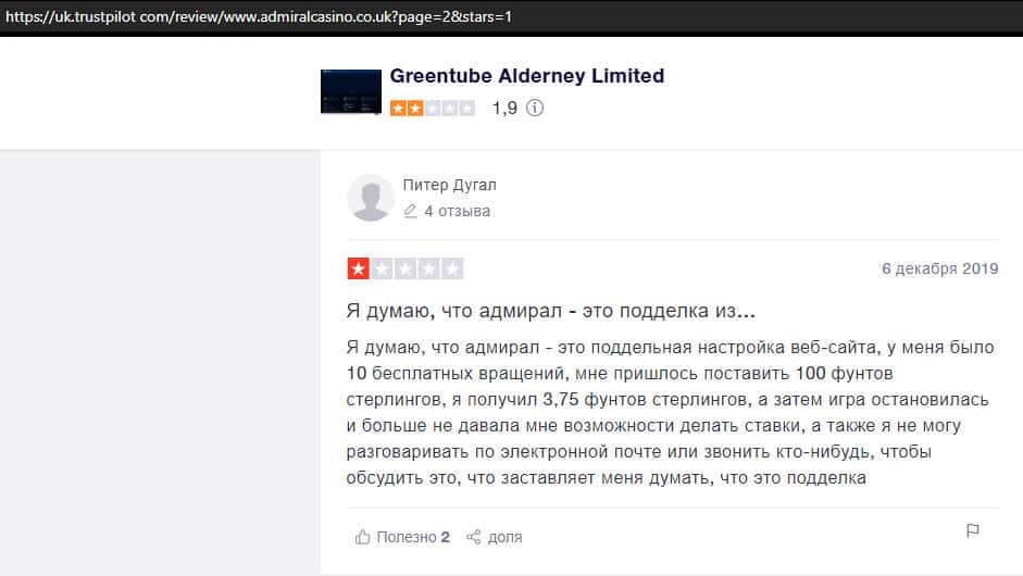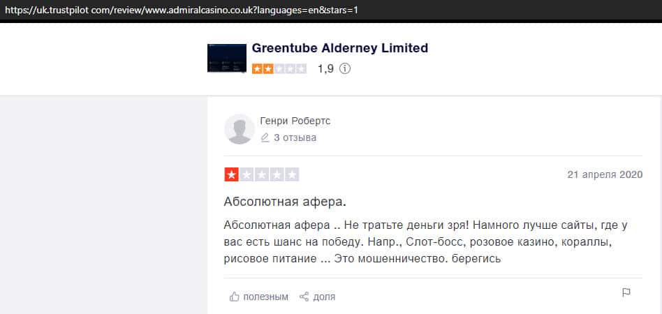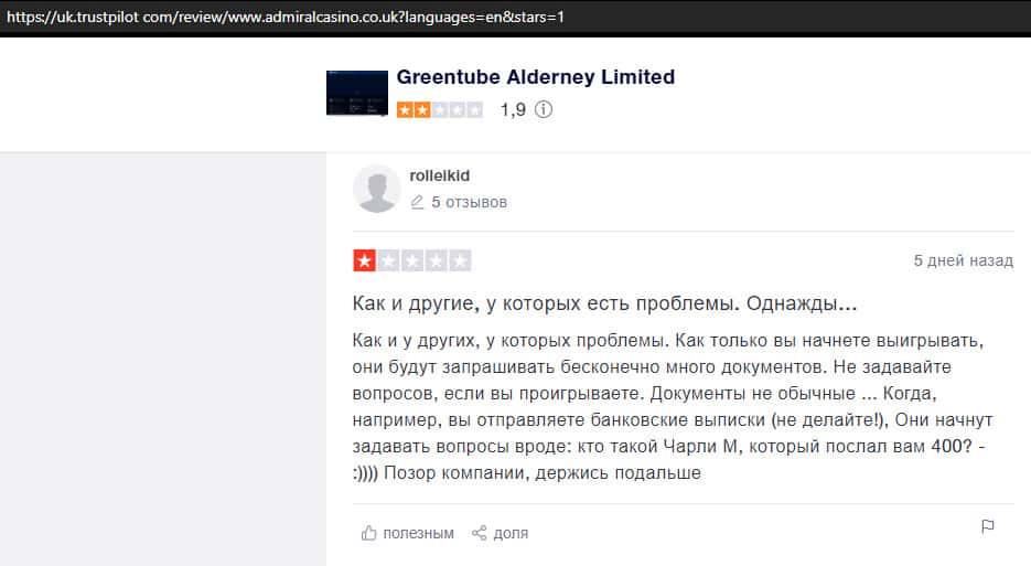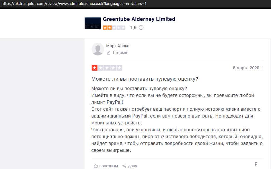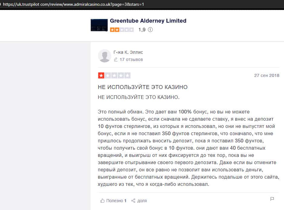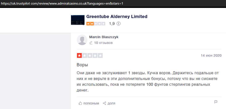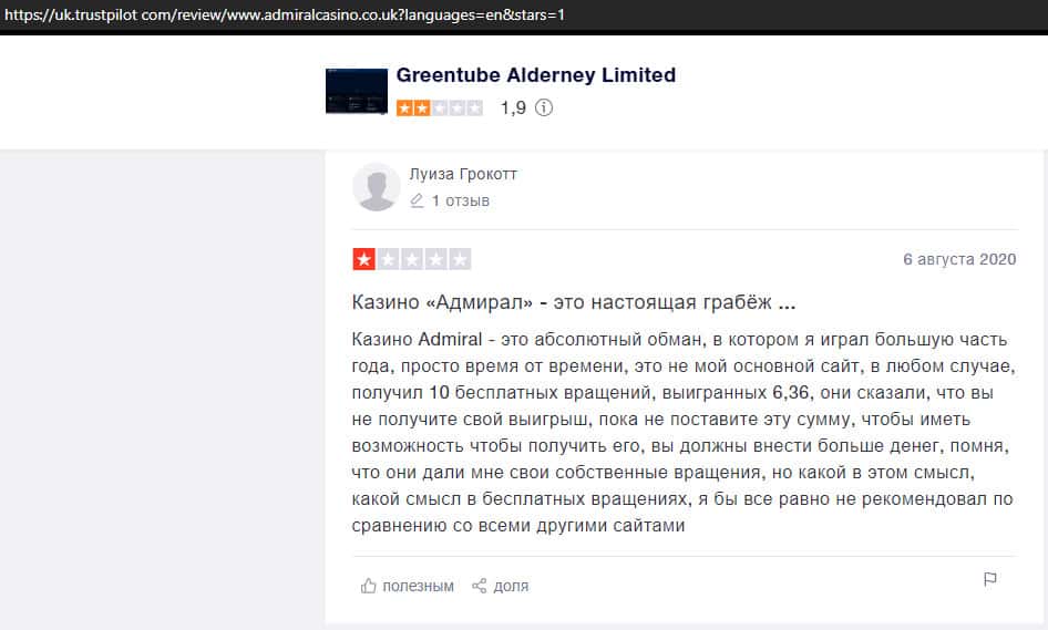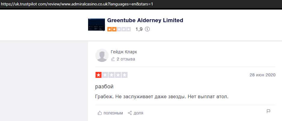 Человек высказал свое мнение касательно мошеннической организации Адмирал Казино, которая не заслуживает ни одной звезды, так как нет никаких выплат.