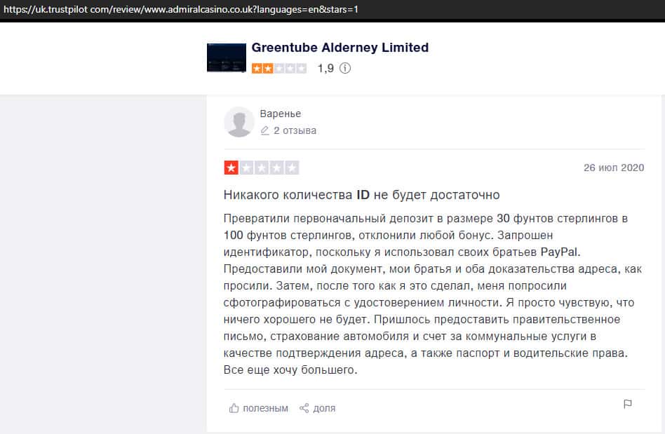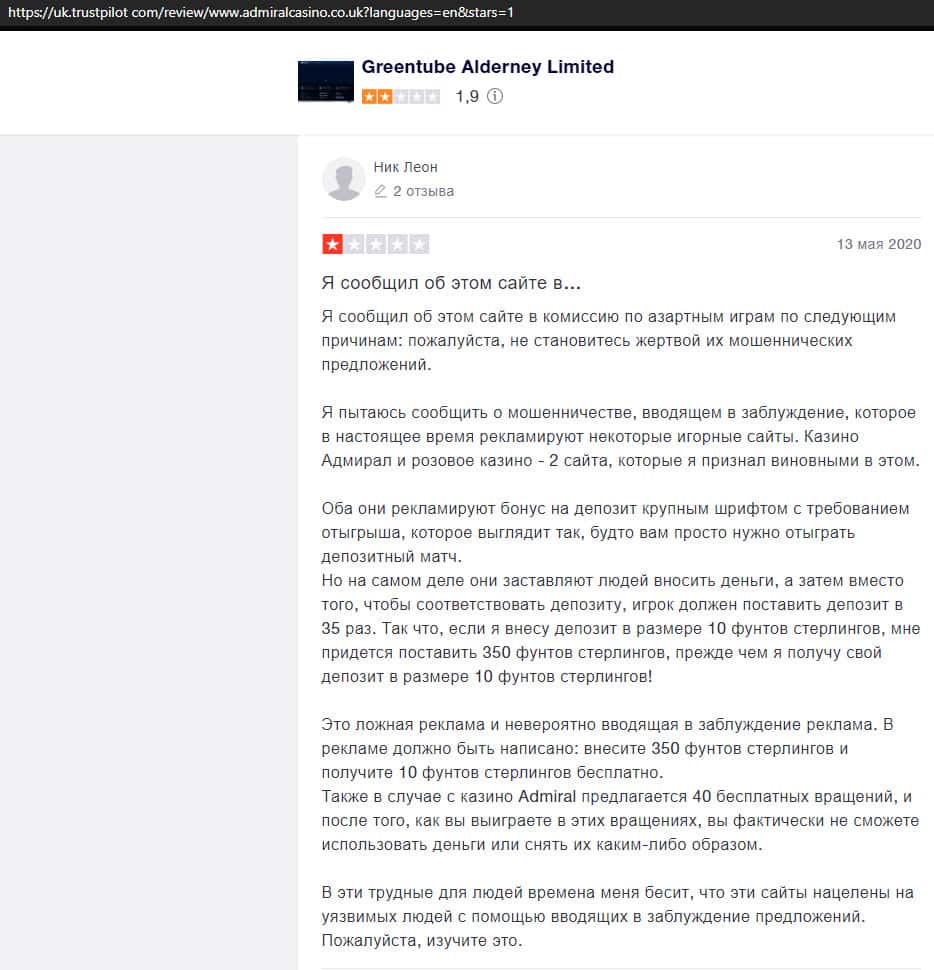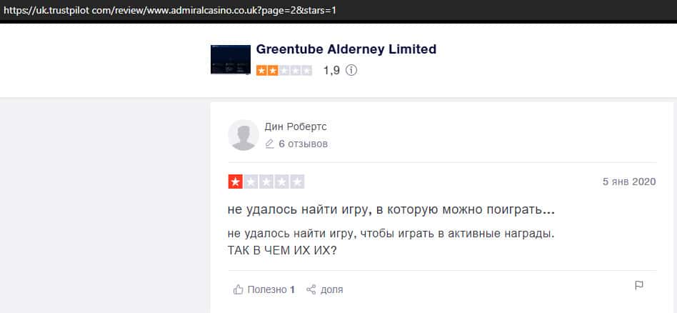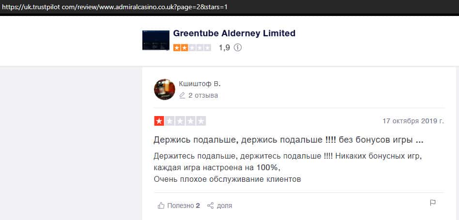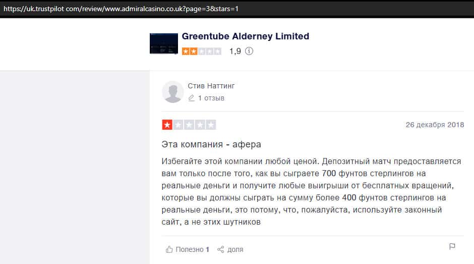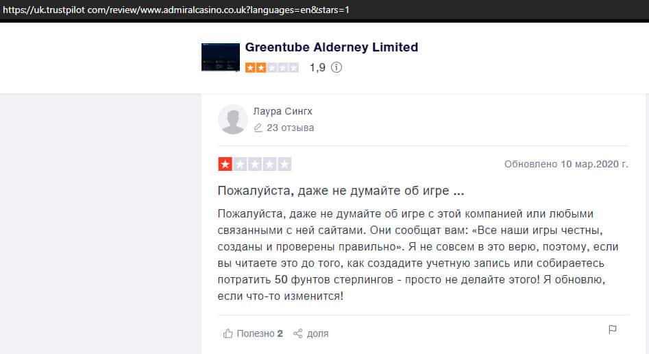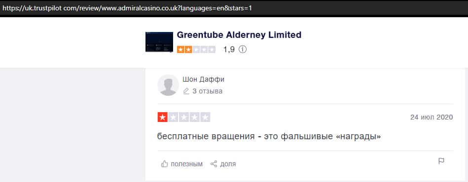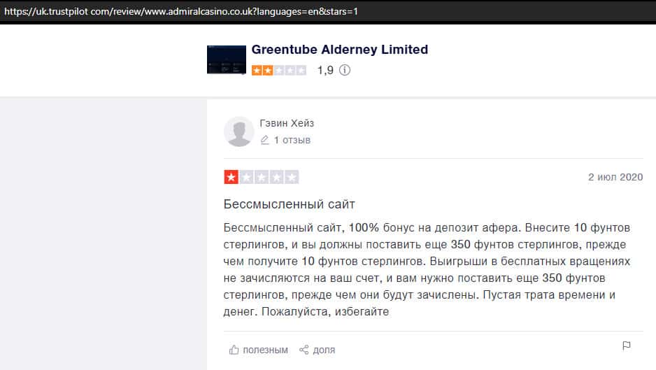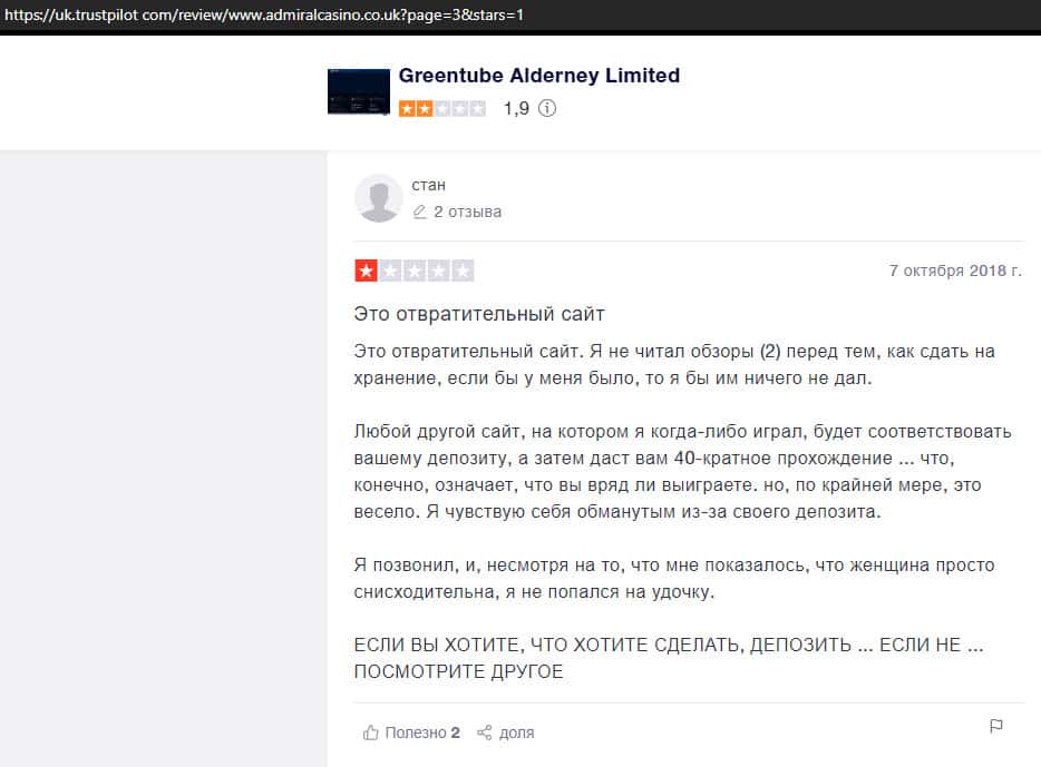 Человек высказал свое мнение касательно мошеннической организации Адмирал Казино, которая не заслуживает ни одной звезды, так как нет никаких выплат.