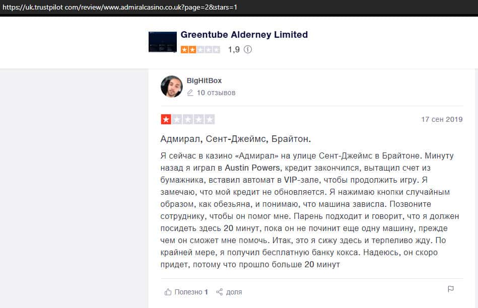 А в этом отзыве клиент вовсе напрямую зашел в реальное казино, которое принадлежит Адмирал Казино и там поломался автомат, в который он вкинул деньги.