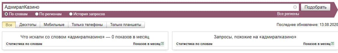 Если проверить насколько часто вводят бренд конторы "АдмиралКазино", то здесь мы можем увидеть показатель в размере 0 показов в месяц.