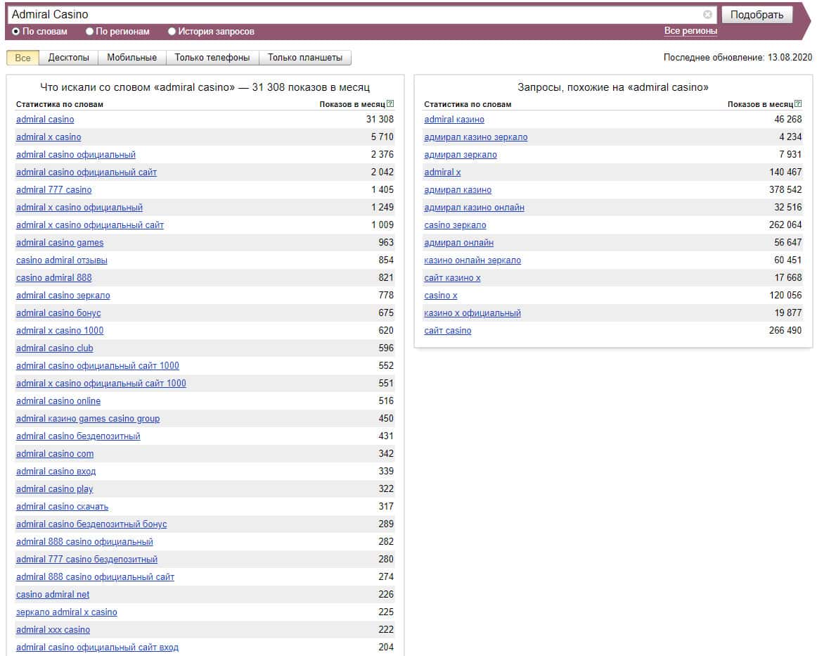 По поводу англоязычного запроса конторы "Admiral Casino" мошенники в Яндексе выставили 31308 показа в месяц, что является большим показателем.