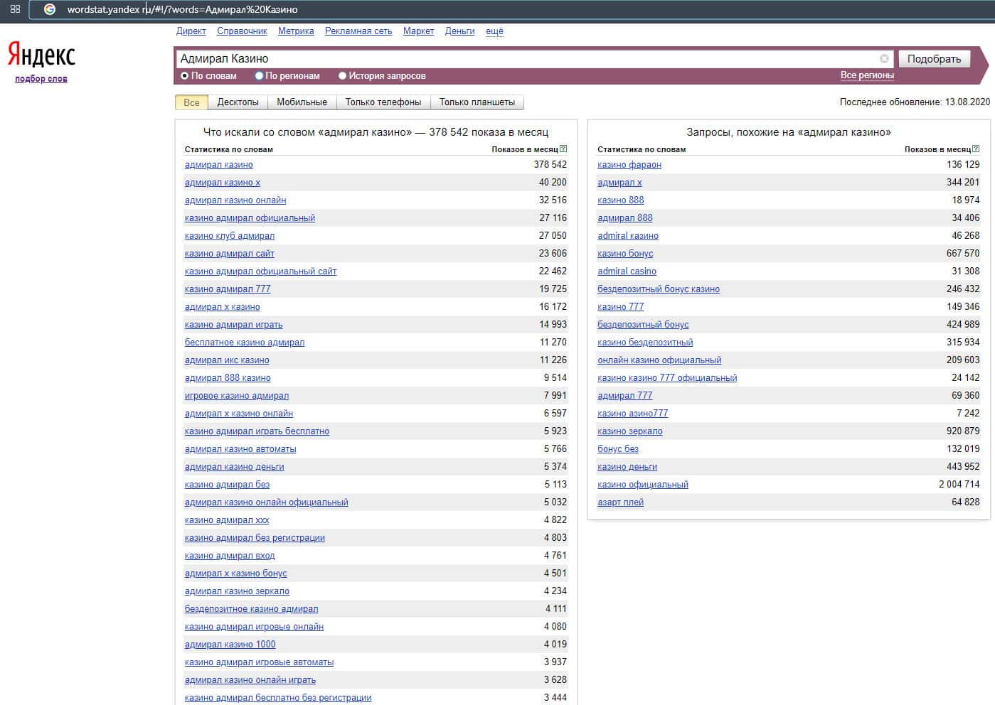В поисковой системе Яндекс, мошенники под брендом "Адмирал Казино" очень популярны и набрали всего 378542 запросов за месяц.