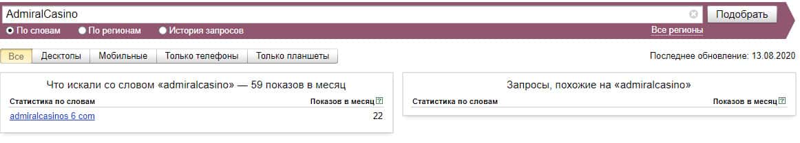 Показатели по бренду лохотрона "AdmiralCasino" немного другие и насчитывают 59 показов за месяц. Мошенники по такому запросу малопопулярны в поисковой системе Яндекс.