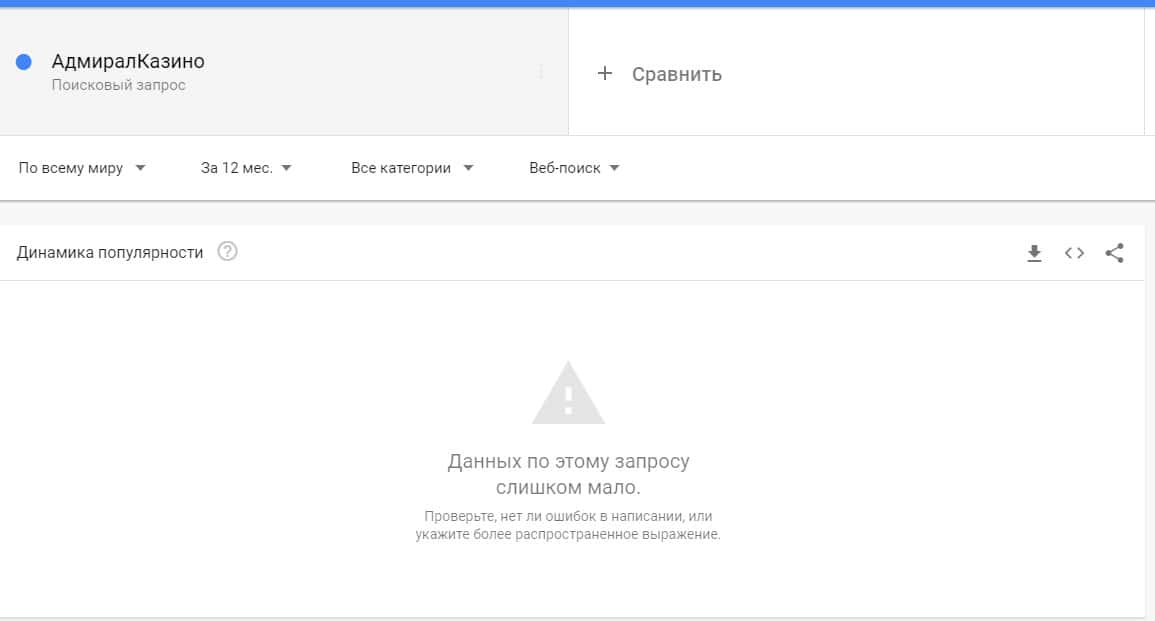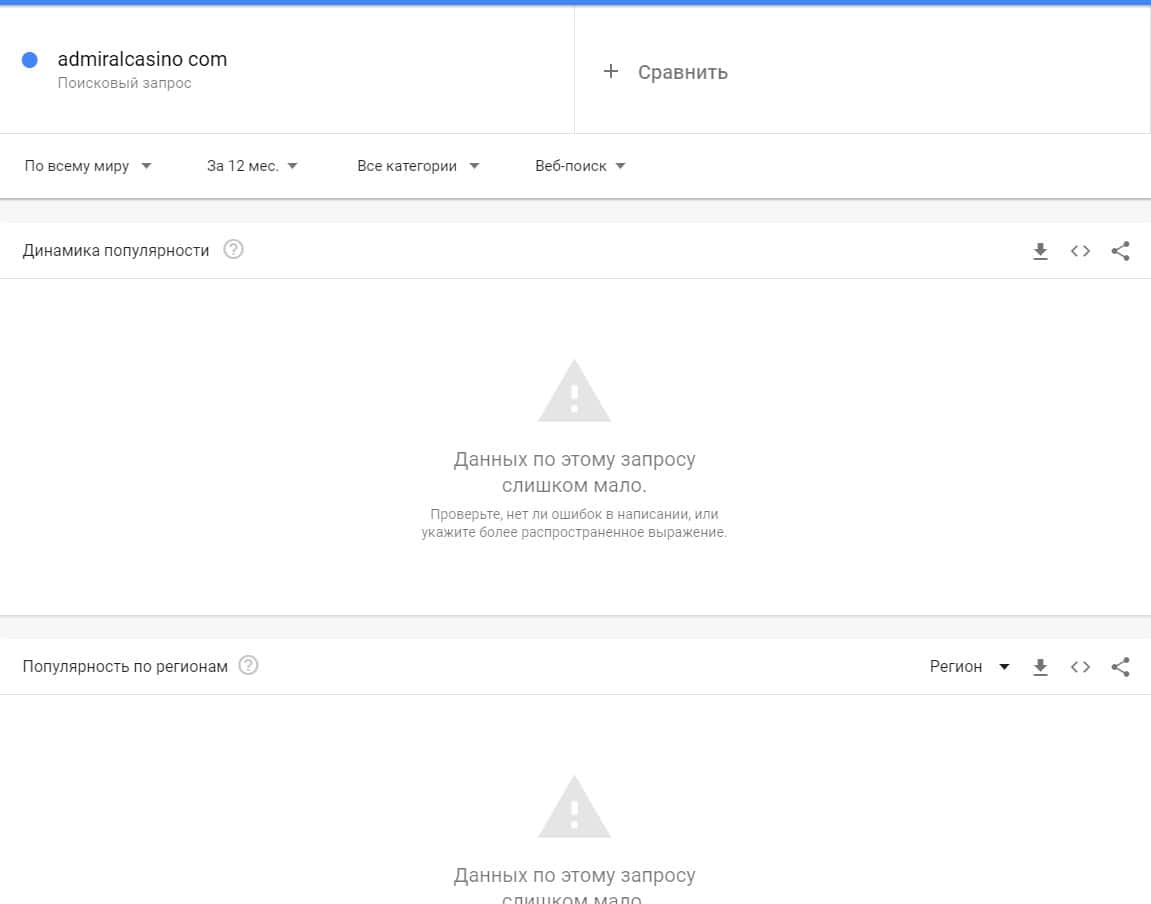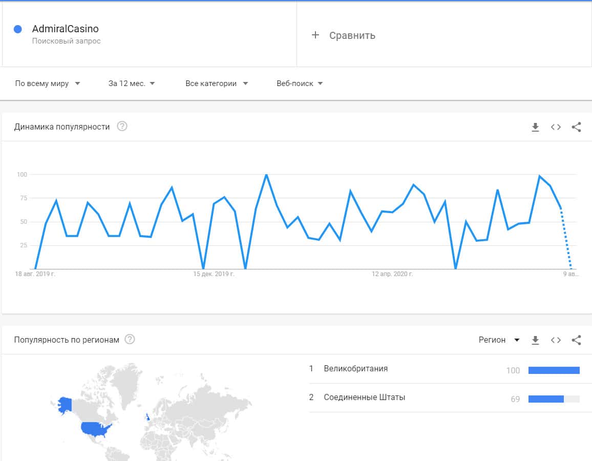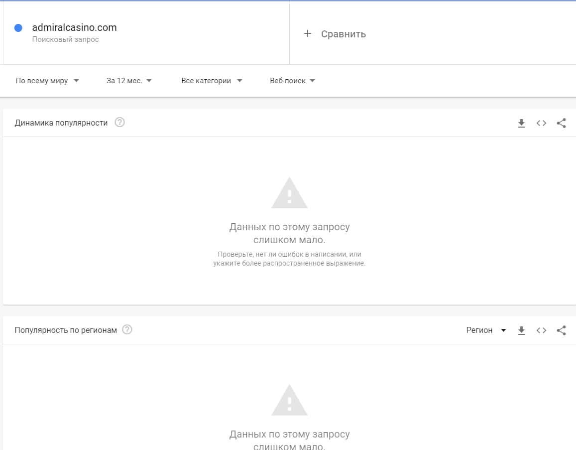 Та же ситуация и с обычным сайтом "admiralcasino.com", данных о котором в запросах Гугл Трендс не было обнаружено.