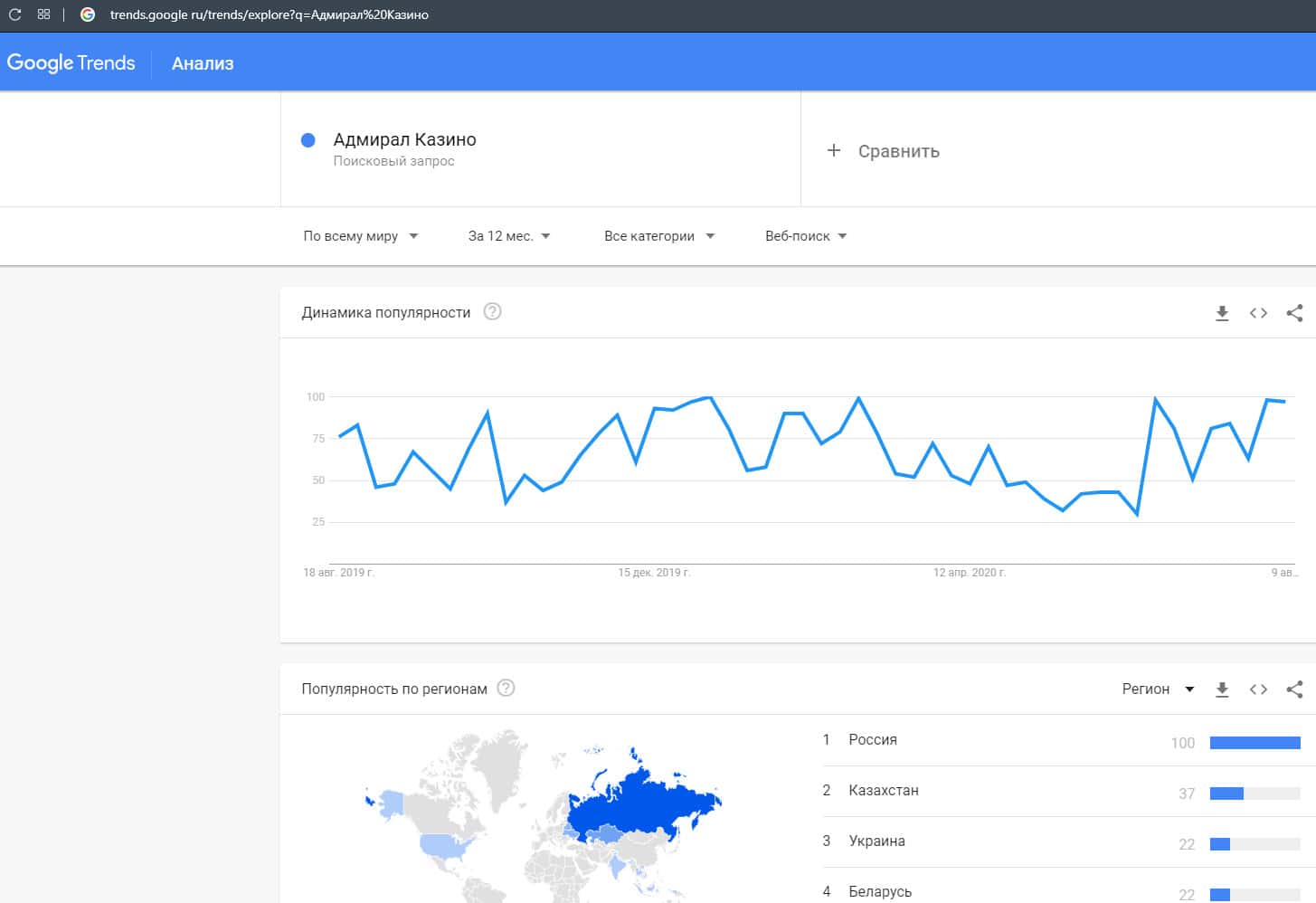 По версии Гугл Трендс мошенники с брендом "Адмирал Казино" набрали достаточное количество показов и в основном они шли из России, Казахстана, Украины и Беларуси.