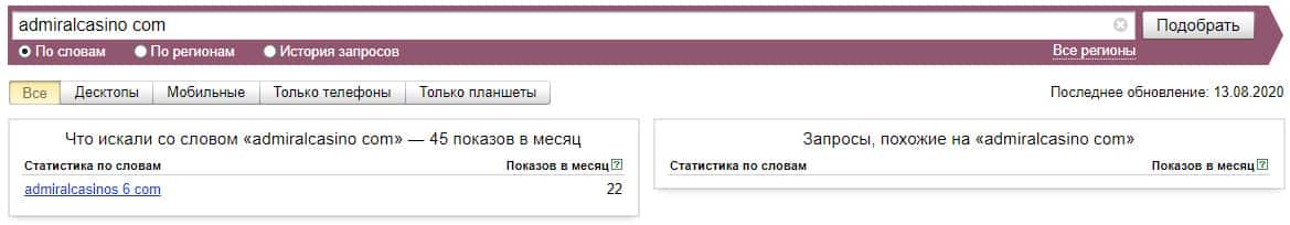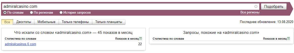 Ну и конечно же бренд "admiralcasino.com" по версии Яндекс.Вордстат набрал 45 показов, что показывает их очень низкую популярность в интернете.