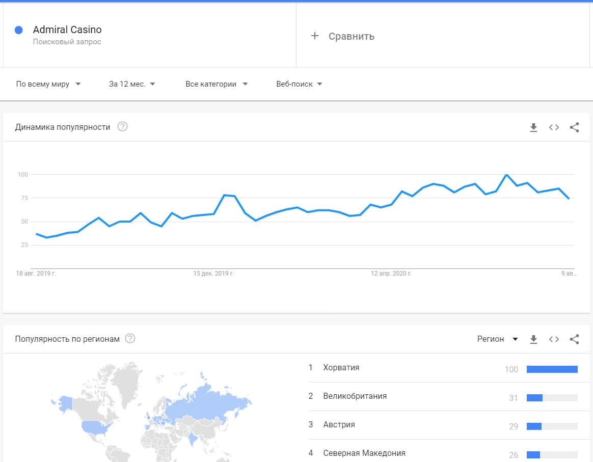 Другая ситуация и с брендом "Admiral Casino", который набрал множество показов в месяц, что показывает их высокую популярность в интернете и запросы идут в основном их Хорватии.