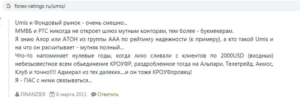 При обсуждении конторы UMIS на форуме трейдеров один из зарегистрированных пользователей просто оборал эту шарагу. Никакой это не брокер, ему просто тупо не дадут доступ для выхода на международные рынки. Юзеры, опомнитесь, не доверяйте деньги лохотрону.