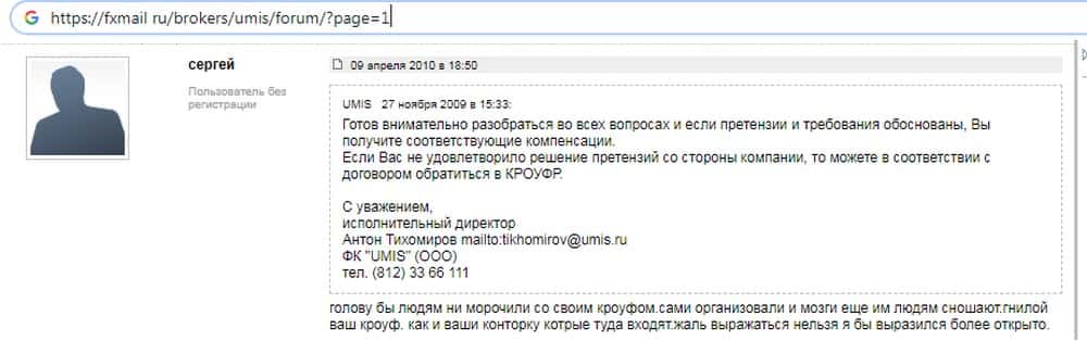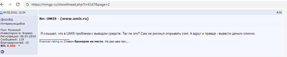 Этому юзеру повезло - он наткнулся на правдивый отзыв о шарашке UMIS, прежде, чем вложить туда деньги. Пользователь пишет, что вкладчикам данной конторы отказывают в выводе средств без причин. Это правда, мошенники так и поступают, после закрывая доступ к аккаунту и исчезая с горизонта облапошенного бедолаги.
