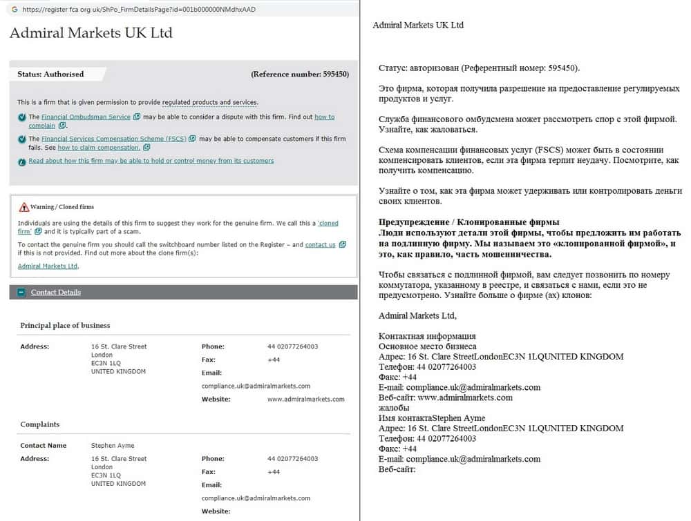 Более того, если перейти на сайт регулятора FCA по указанному номеру, увидим, что лицензия выдана вовсе не конторе UMIS. В договоре и официальных документах наша шарага называется Admiral Markets Pty Ltd, в лицензии же другое название, причем, есть предупреждение об использовании документа мошенниками.