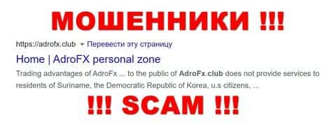Мошенническая контора "AdroFX Club" также не ищется в поисковике Гугл и по запросам сайта, только без точки, что показывает их непопулярность.