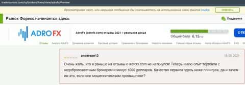 В данном отзыве автор жалуется на то, что он потерял в конторе Адро ФХ огромную сумму денег. Аферисты слили его счет на 1000 долларов и теперь он не может с ними связаться.