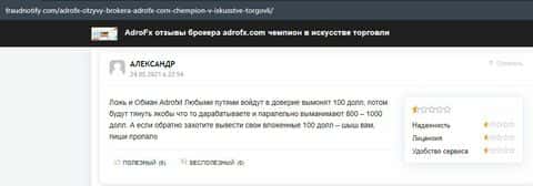 Далее представлен еще один отзыв касательно мошеннической конторы AdroFX Club. Мошенники занимаются вымогательством и в данном случае выманили 100 долларов и не отдают.