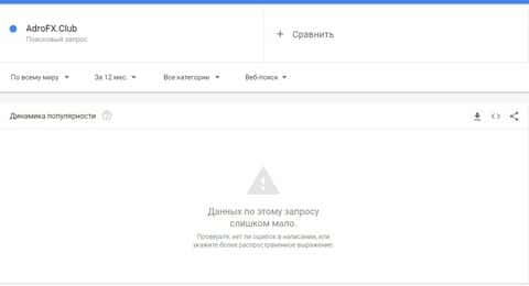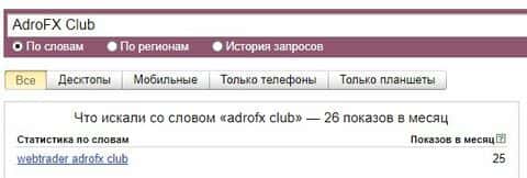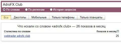 Немного ситуация поменялась, если вместо самого названия лохотрона ввести сайт без точки в домене "AdroFX Club". Показатели достигли значения 26 показов за месяц