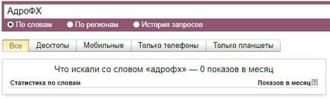 Шарага "АдроФХ" не популярна среди русскоязычного населения. Как раз из-за этого и количество запросов за последний месяц составил нулевое значение.