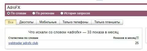 А вот англоязычное название бренда "AdroFX" мошенники немного распространили в поисковой системе Яндекс и набрали порядка 33 показов за месяц.