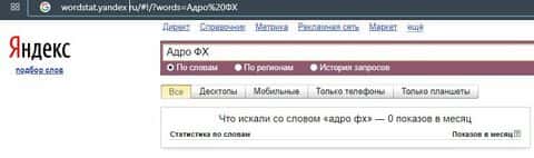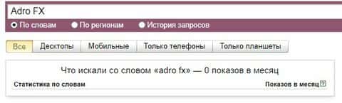 Другая ситуация и с брендом "Adro FX", который не популярен в поисковой системе Яндекс, так как не набрал ни единого показа за последний месяц.