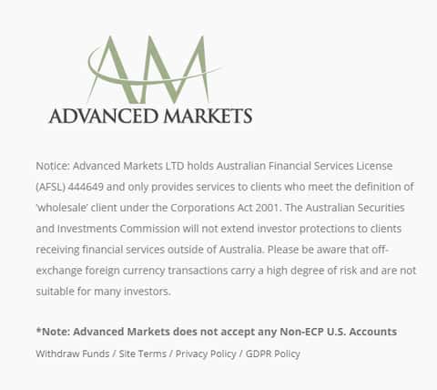 Завершается сайт у аферистов Advanced Markets ссылками, на различные разделы сайта мошенников, контактами и предупреждением о том, что лицензия лохотрона Адвенцед Маркетс распространяется исключительно на территорию Австралии, соответственно ответственность за убытки пользователей с других стран жулики Advanced Markets нести не будут.