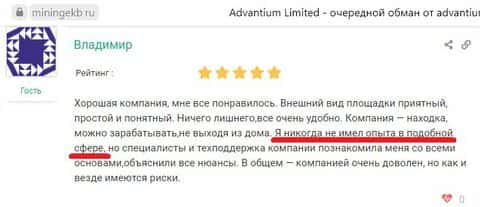 И еще один лже-отзыв, где пользователь Адвантиум Лимитед утверждает, что работает с этим лохотроном не менее полугода назад, в то время когда аферистам, напоминаем, всего месяц.