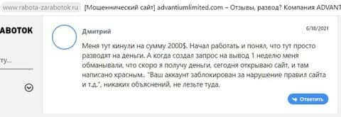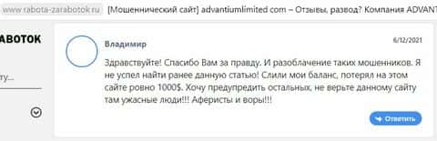 А вот уже отзыв пользователя, пострадавшего от реальной кидальной деятельности аферистов Адвантиум Лимитед. Аферисты и воры AdvantiumLimited слили его баланс в 1000 долларов.