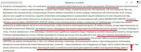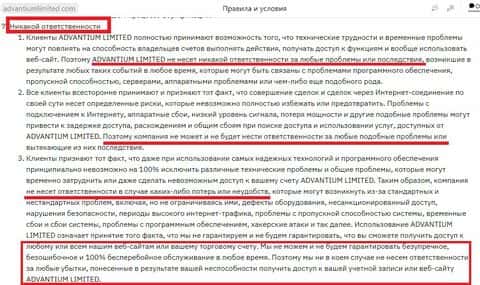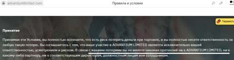 Отдельным выделенным пунктом у мошенников Адвантиум Лимитед написано, что клиенты со своими потерями не должны иметь ни каких претензий ни к ним, ни к партнерам.