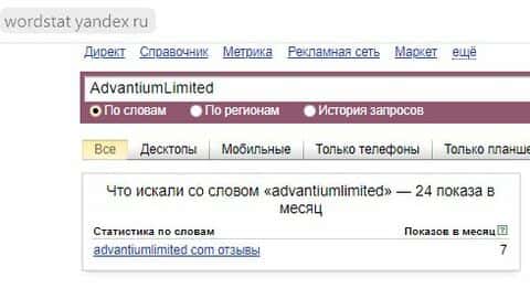 По англоязычному бренду "AdvantiumLimited" в поисковике Яндекс было сделано 24 поисковых запроса.
