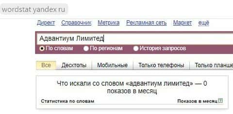 В поисковике Яндекс по запросу бренда "Адвантиум Лимитед" пользователи не сделали ни одного запроса за месяц. Никому не интересна эта сомнительная помойка.