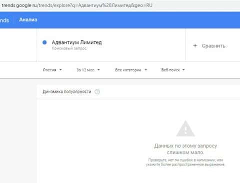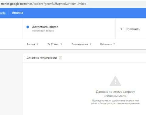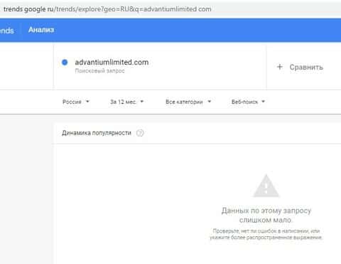 Понятно, что и по бренду advantiumlimited com в Google тоже не отражаются поисковые запросы.